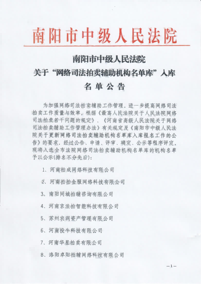 名稱:南陽市中級(jí)法院網(wǎng)絡(luò)司法拍輔機(jī)構(gòu)名單庫